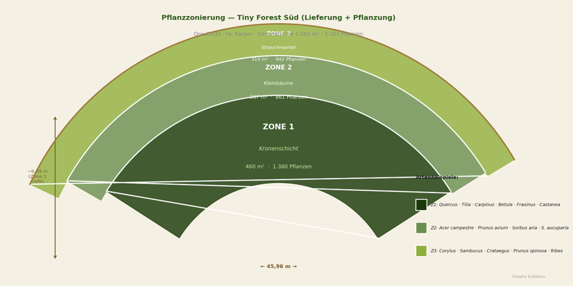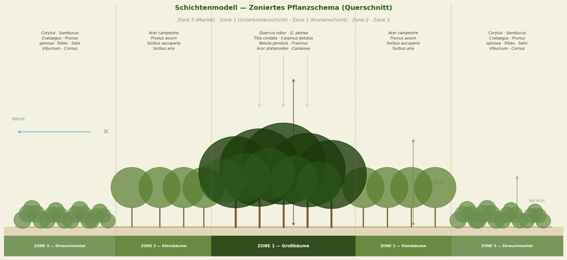 Rund ein Drittel der Gesamtfläche haben wir gemeinsam in diesen zwei Tagen bepflanzt. Der Rest wird im Laufe der Folgewoche durch unser Fachteam fertiggestellt. Insgesamt entstanden auf 1.483 m² rund 3.600 Jungpflanzen in drei Zonen: Kronenschicht, Unterkronenschicht und Strauchmantel.